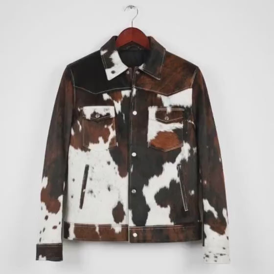 Western Cow Print Leather Jacket, Handmade Cowhide Coat, Hair on Hide Brown Jacket