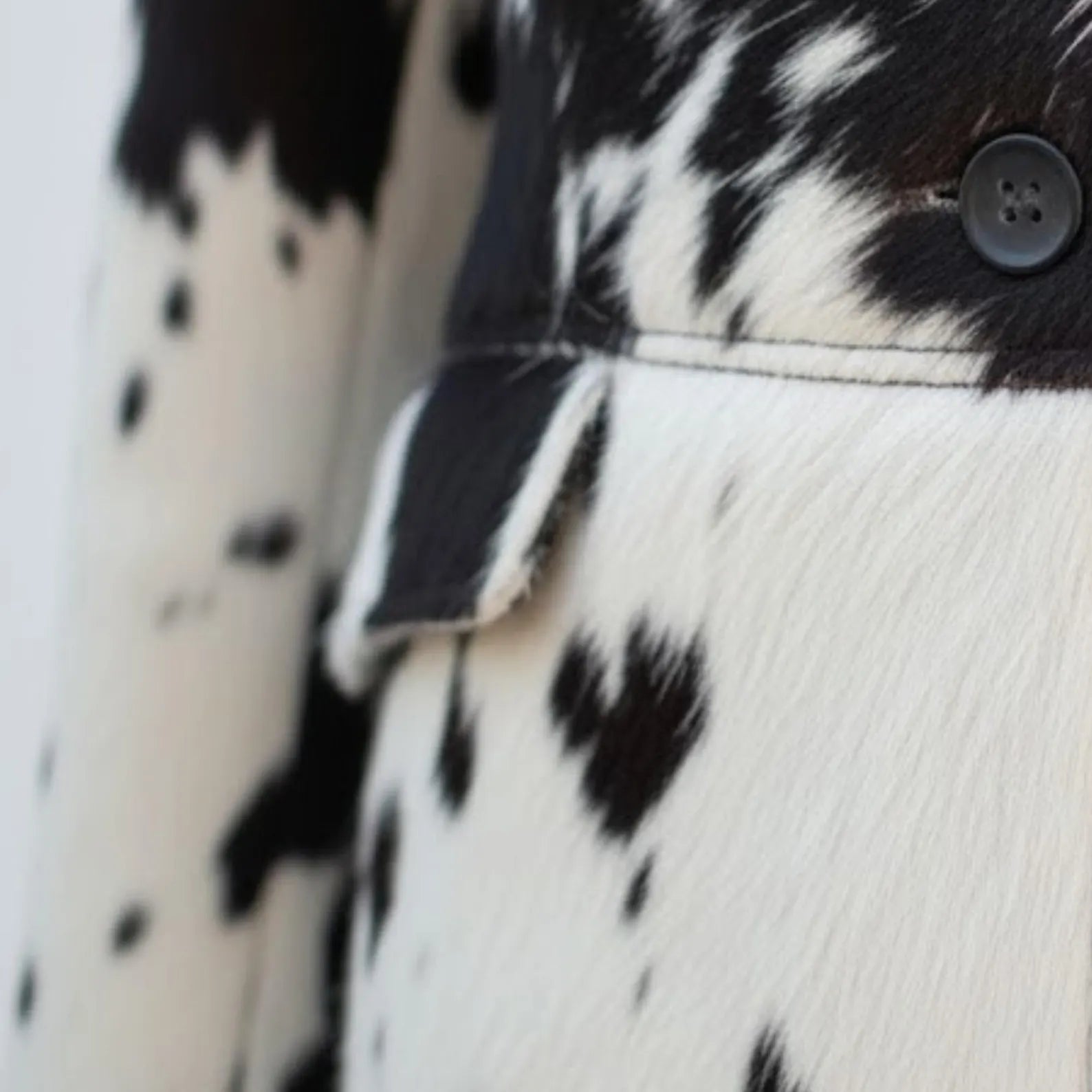 A handmade black and white cowhide jacket with a natural pony hair texture. The coat features a white collar and a striking, asymmetrical animal print pattern with a single-button closure.