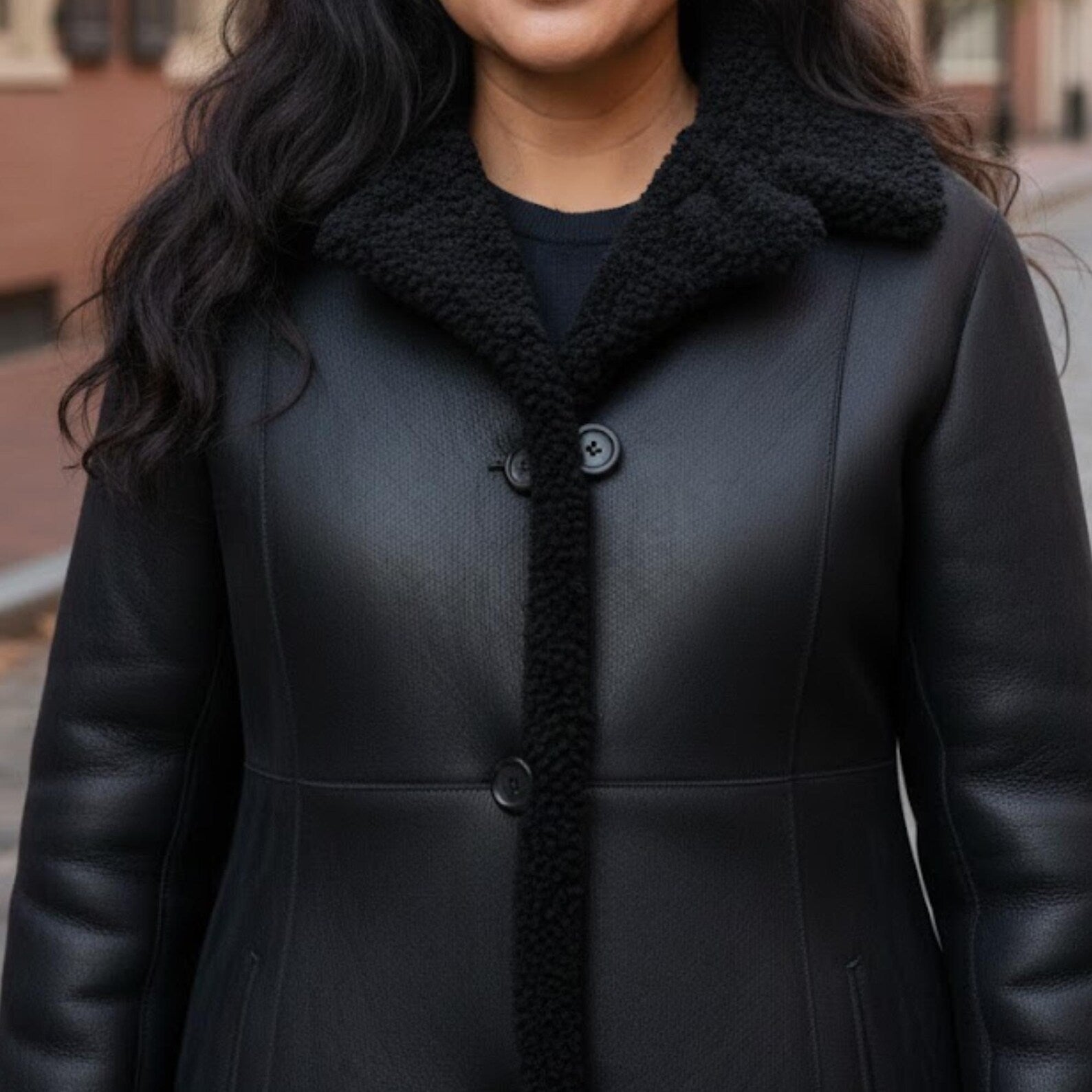Handmade Black Shearling Coat Women – Long Leather Jacket Winter Outerwear