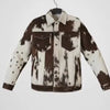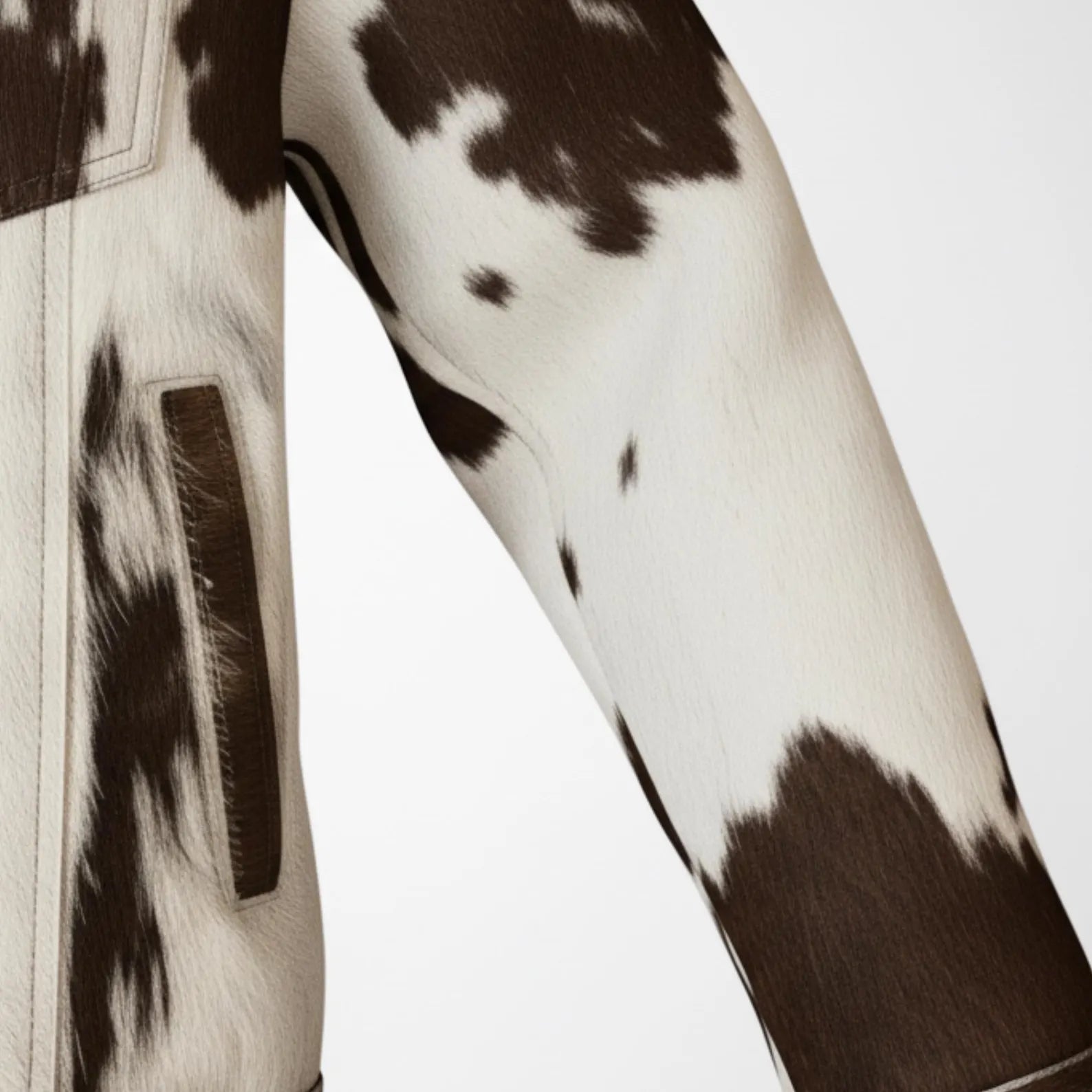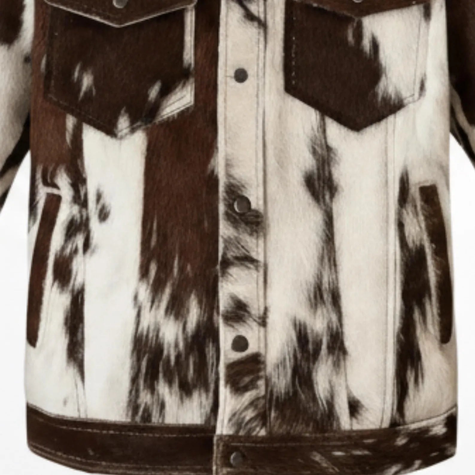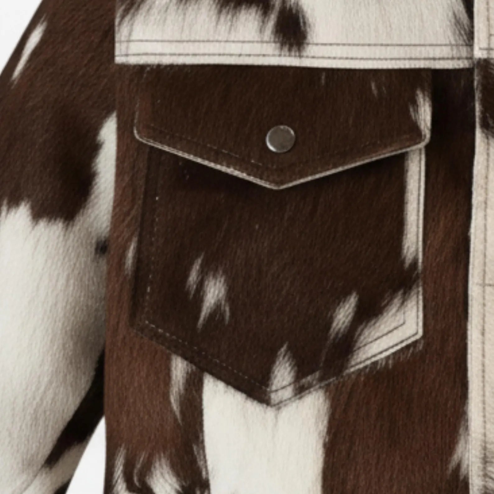 Discover this standout cow print faux-fur trucker jacket in rich brown and cream tones. Whether you’re embracing Western vibes urban street style or cozy farmhouse aesthetics this jacket works as a statement piece wearable for men or women.